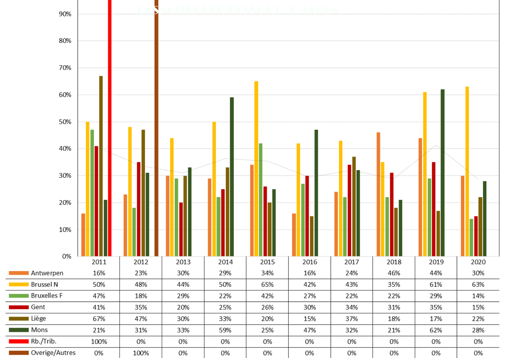 Het aantal cassaties is ten aanzien van het jaar 2019 gedaald en bedraagt momenteel ongeveer 37 pct. Het aantal vernietigingen in de Nederlandstalige en Franstalige afdeling bevindt zich op hetzelfde niveau. Over een langere periode kan worden vastgesteld dat het jaarlijks percentage vernietigingen globaal tussen 35 en 45 pct. varieert.